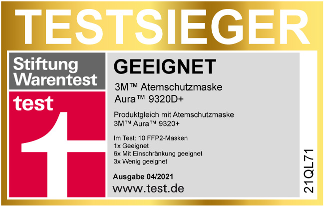 TESTSIEGER - 3M Aura 9320+ Atemschutzmaske Die 3M Aura 9320+ FFP2 Atemschutzmaske ist Testsieger bei Stiftung Warentest. Besonders überzeugen konnte Sie mit einer guten Passform, die an mehreren Personen getestet wurde. Dies ist besonders wichtig, damit die benötigte Schutzwirkung gegeben ist. Auch für Brillenträger ist die Atemschutzmaske gut geeignet, da Siegelpunkte auf der Oberseite der Maske das Beschlagen von Brillen reduzieren. Außerdem wurde mit einer Art künstlichen Lunge gemessen, wie gut mit der Maske geatmet werden kann. Auch hier überzeugte die 3M Maske, da eine leichte und komfortable Atmung möglich ist. Insgesamt schnitt die Atemschutzmaske in allen Prüfungen überdurchschnittlich gut ab – ob Filterwirkung, Passform, Atemkomfort oder möglich enthaltene Schadstoffe.
